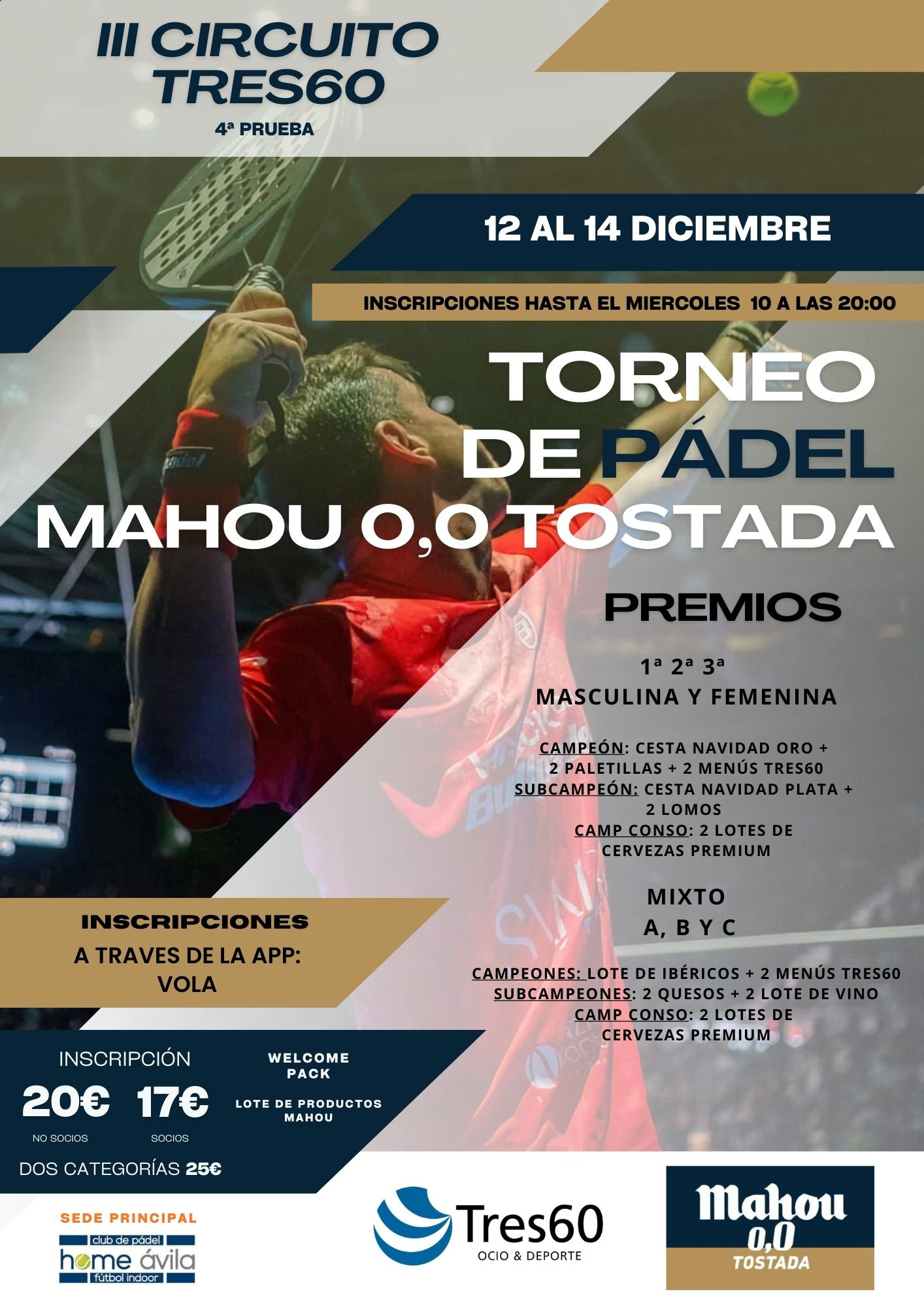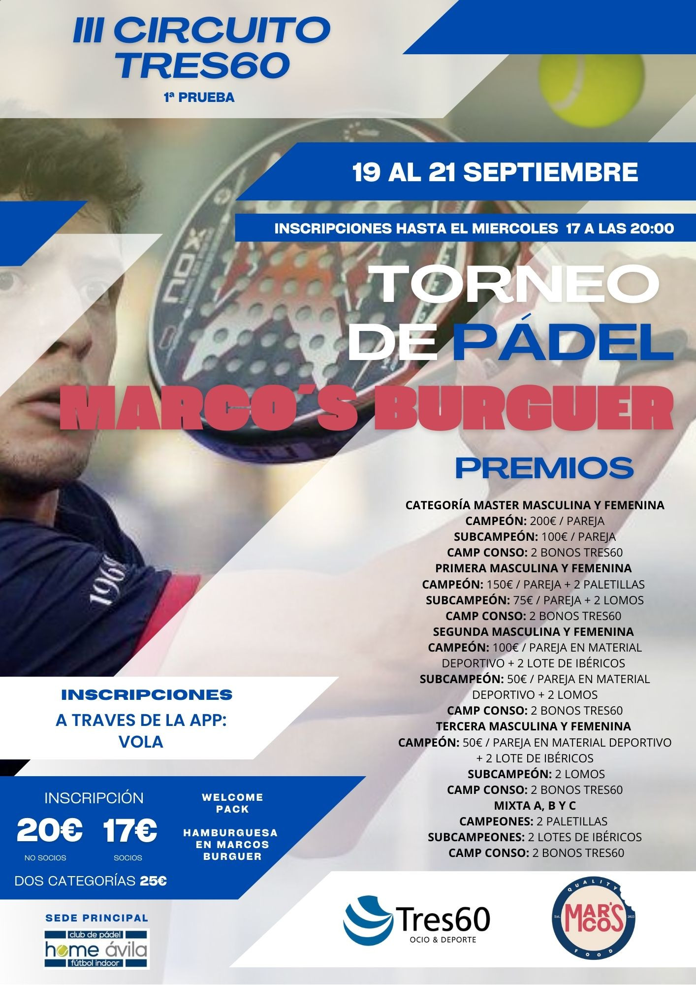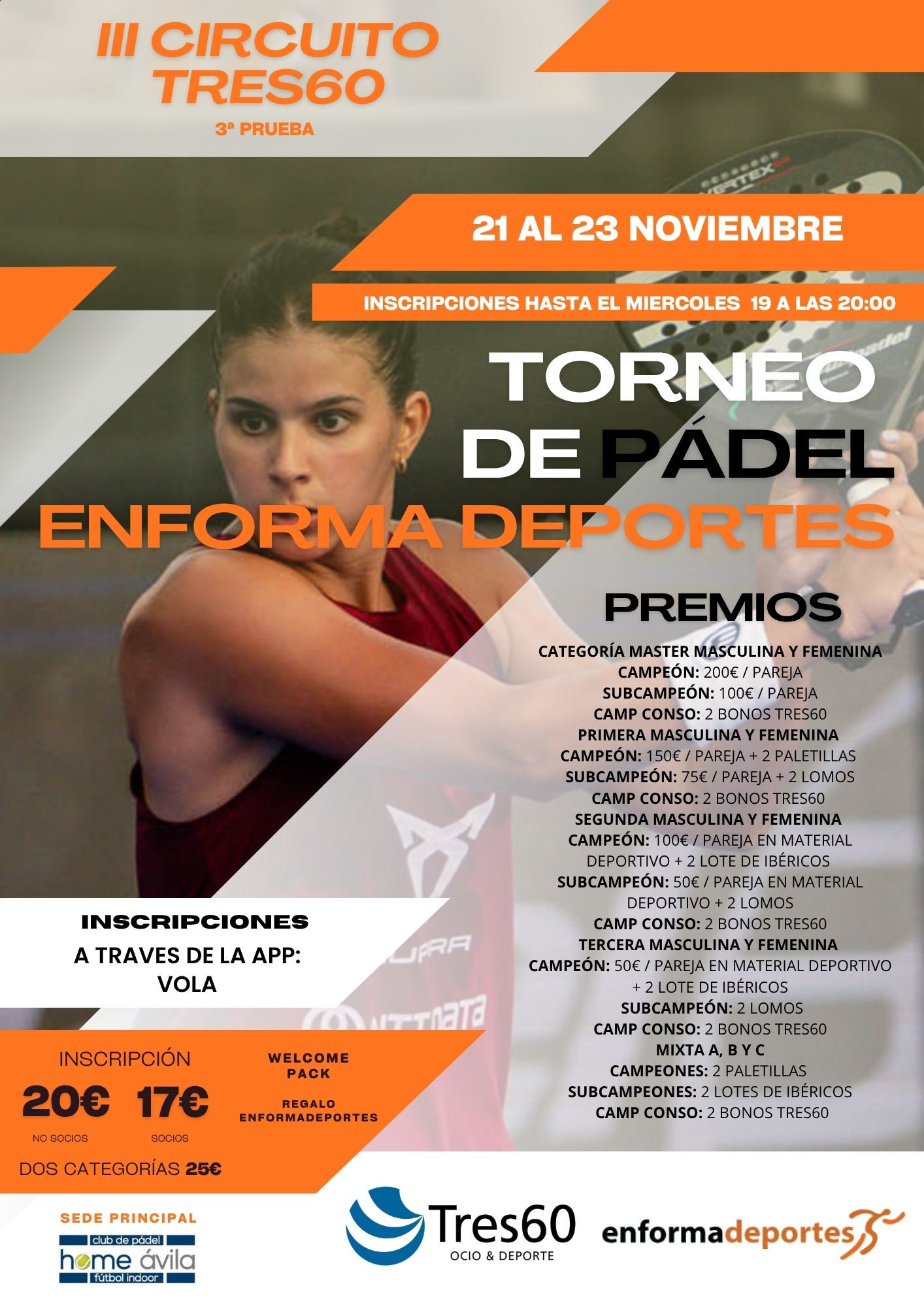 Tres60 es la oferta de ocio y deporte más grande de la ciudad de Ávila, con más de 9000 metros cuadrados indoor divididos en dos instalaciones, Tres60 Ocio y Deporte y Home Pádel Ávila, con multitud de servicios y actividades. TRES60 OCIO Y DEPORTE - 6 PISTAS DE PÁDEL - GIMNASIO + CON 4 SALAS DE CLASES - SALA ENTRENAMIENTO FUNCIONAL - 2 PARQUES INFANTILES - CAFETERÍA RESTAURANTE - SALA DE EVENTOS HOME PÁDEL ÁVILA - 8 PISTAS DE PADEL - CAMPO DE FÚTBOL INDOOR - SALA POLIVALENTE - ZONA INFANTIL - CAFETERÍA Tres60 es la oferta de ocio y deporte más grande de la ciudad de Ávila, con más de 9000 metros cuadrados indoor divididos en dos instalaciones, Tres60 Ocio y Deporte y Home Pádel Ávila, con multitud de servicios y actividades. - 6 PISTAS DE PÁDEL - GIMNASIO + CON 4 SALAS DE CLASES - SALA ENTRENAMIENTO FUNCIONAL - 2 PARQUES INFANTILES - CAFETERÍA RESTAURANTE - SALA DE EVENTOS HOME PÁDEL ÁVILA - 8 PISTAS DE PADEL - CAMPO DE FÚTBOL INDOOR - SALA POLIVALENTE - ZONA INFANTIL - CAFETERÍA